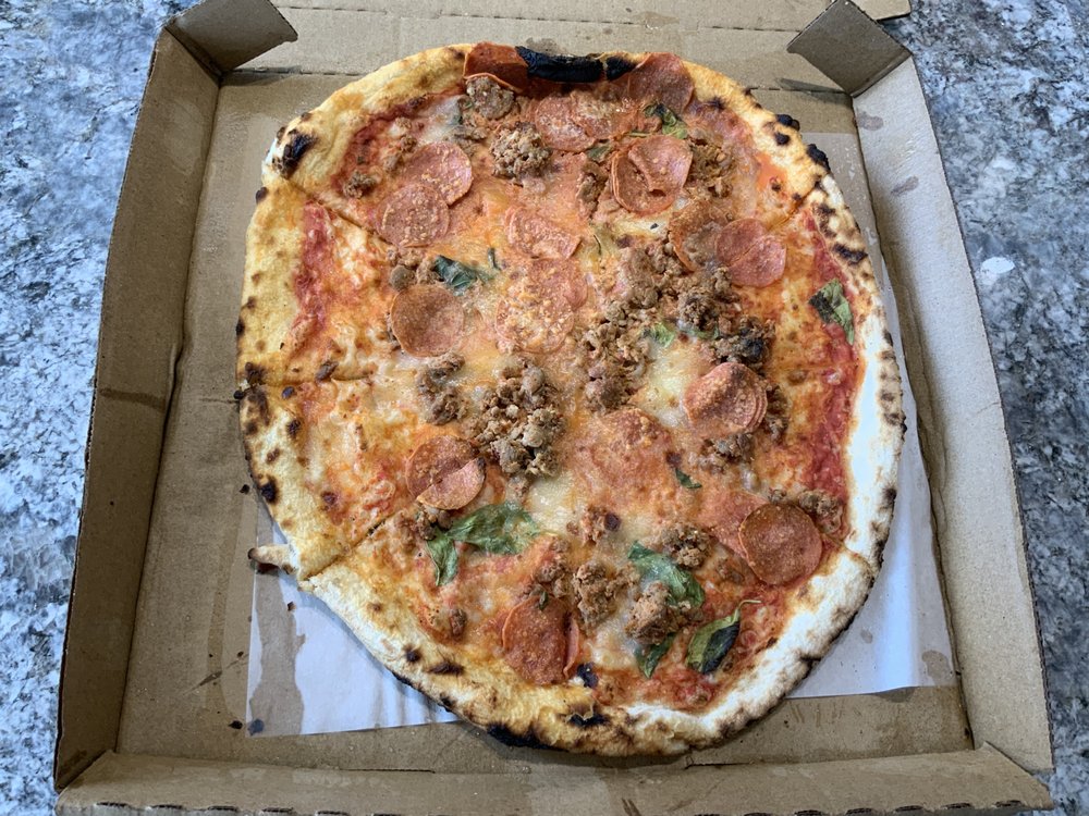 Stir-fried yellow noodle with egg, broccoli, jalapeño peppers, Chinese broccoli, onion, red bell pepper, and Thai basil with a garlic-chili black soy sauce.